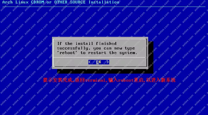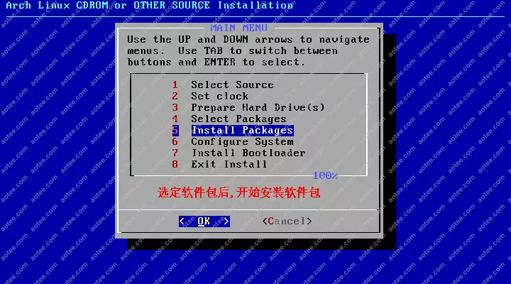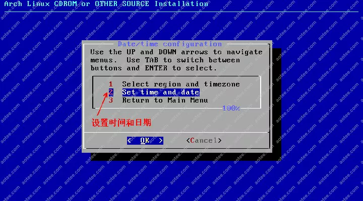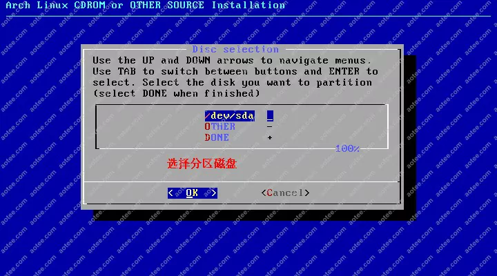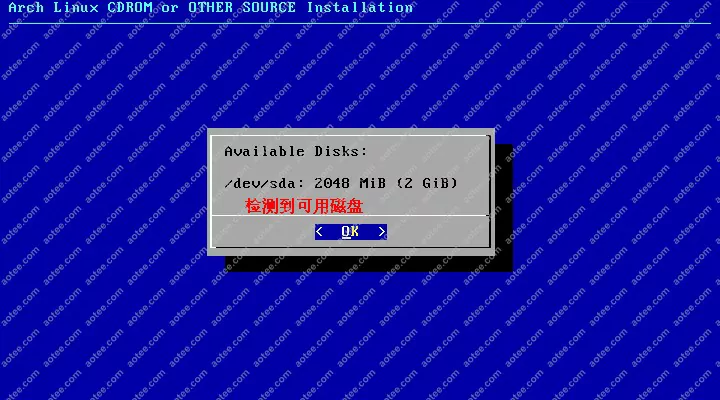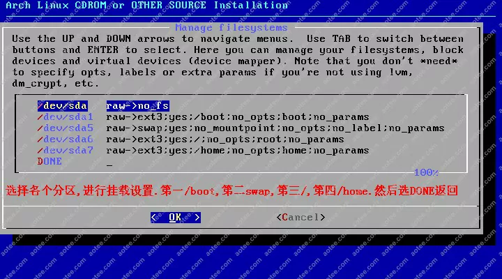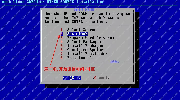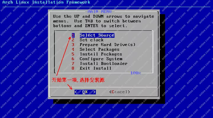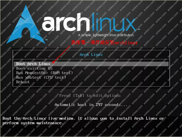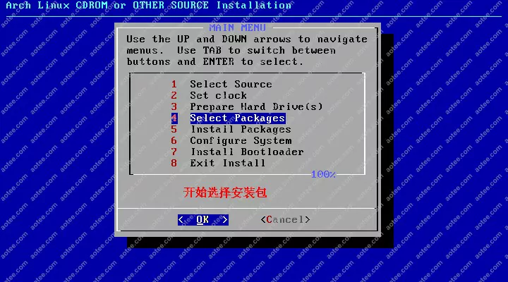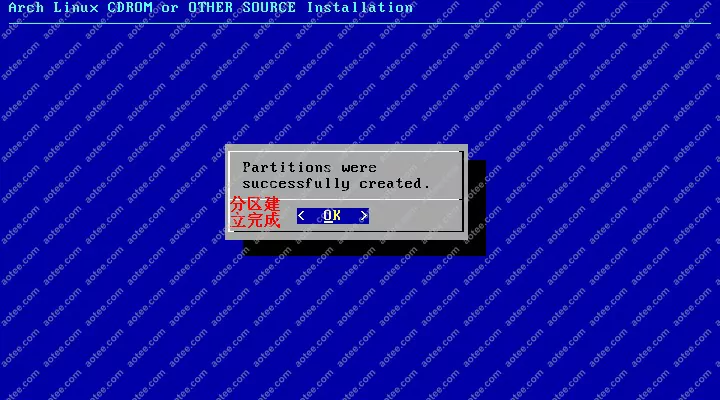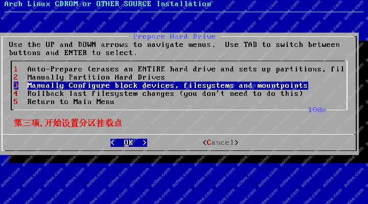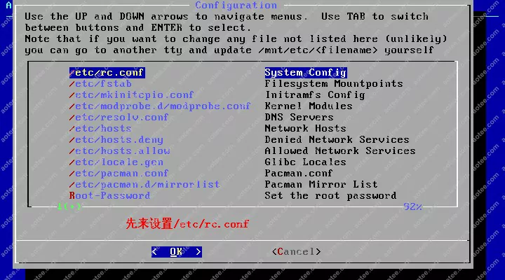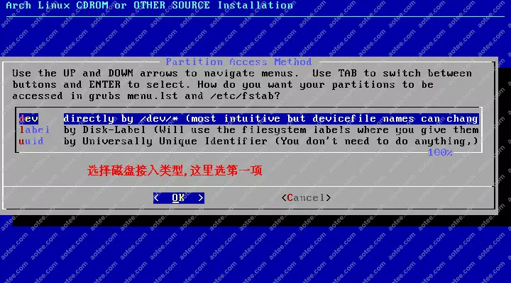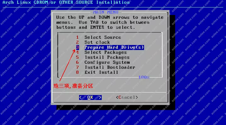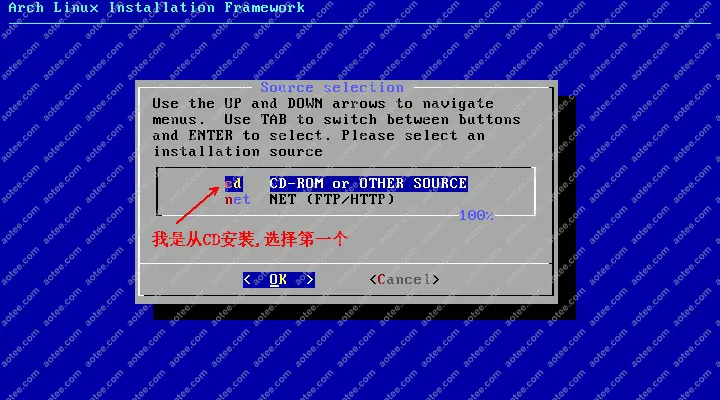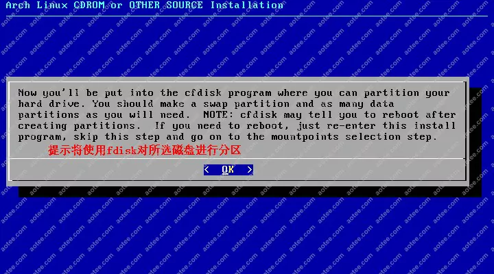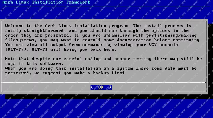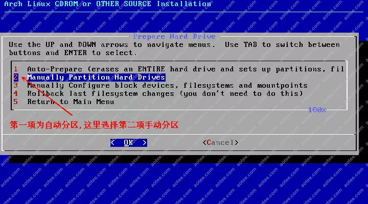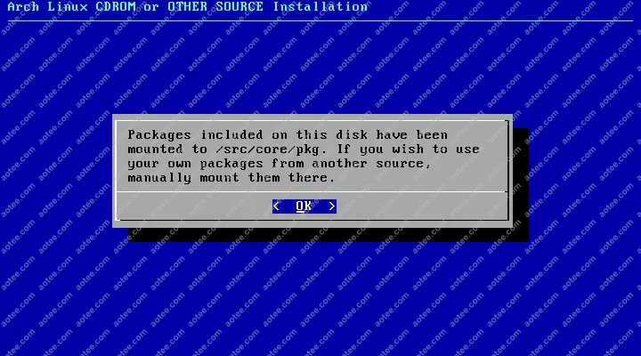 使用root,密码为空登陆liveCD,然后输入/arch/setup开始安装