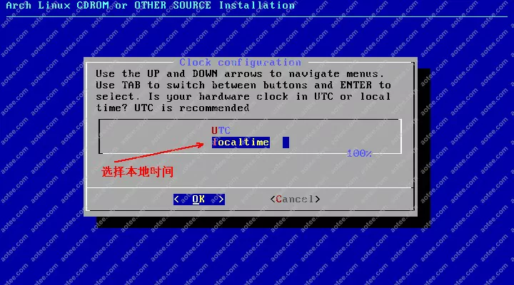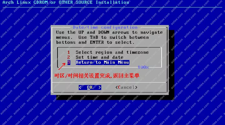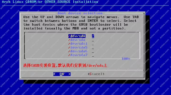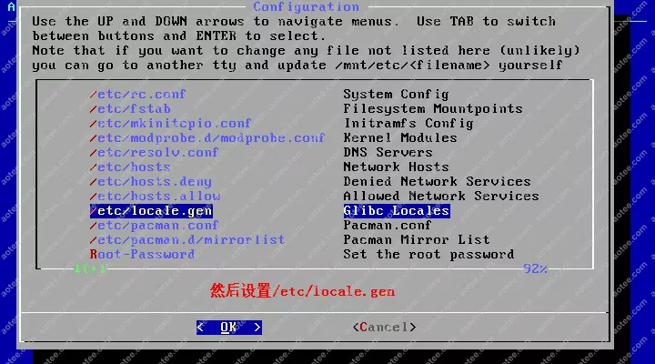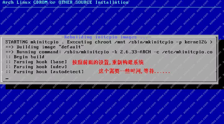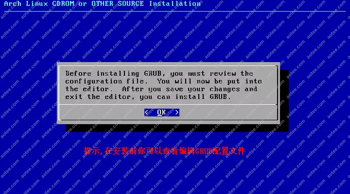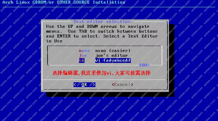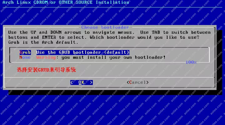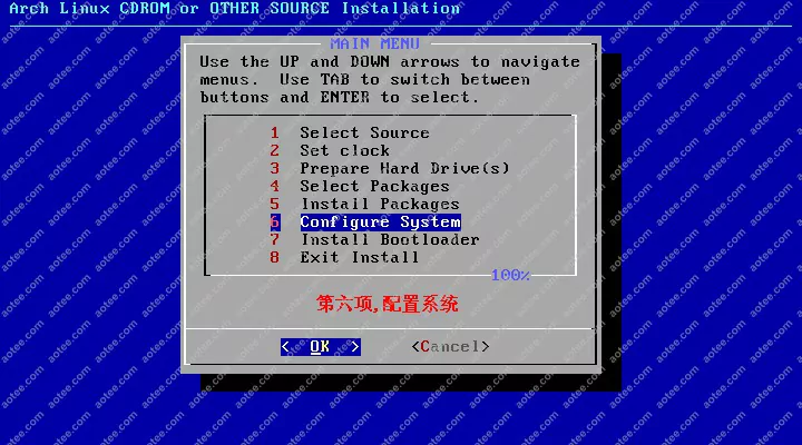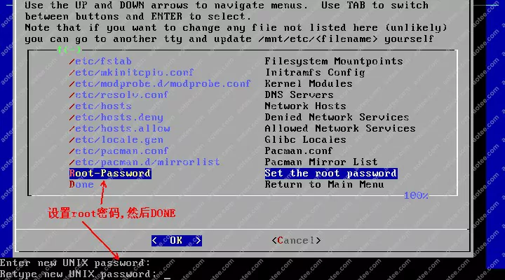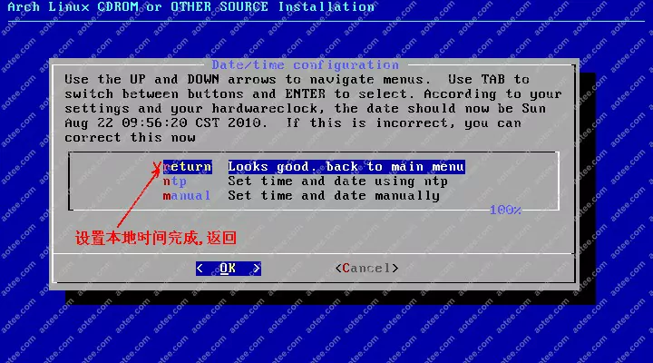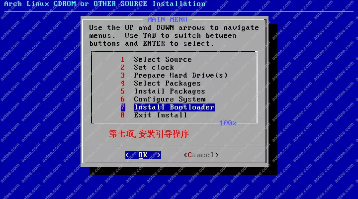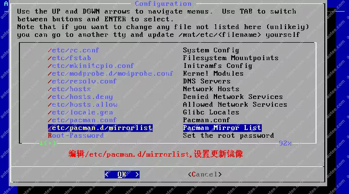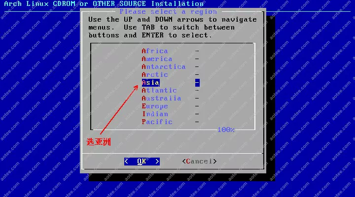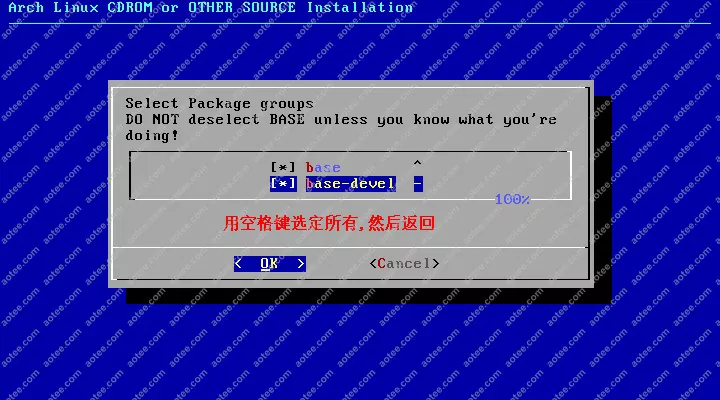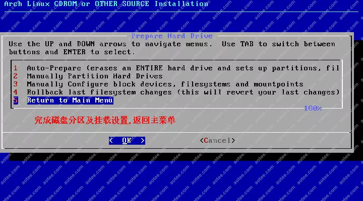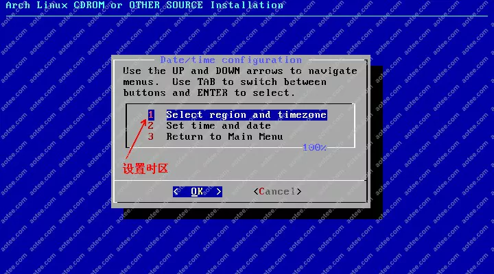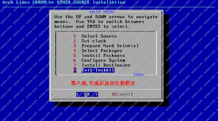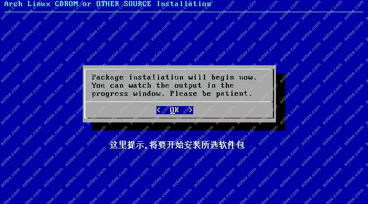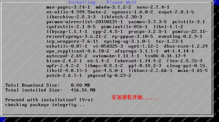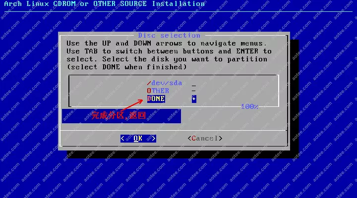 使用root,密码为空登陆liveCD,然后输入/arch/setup开始安装