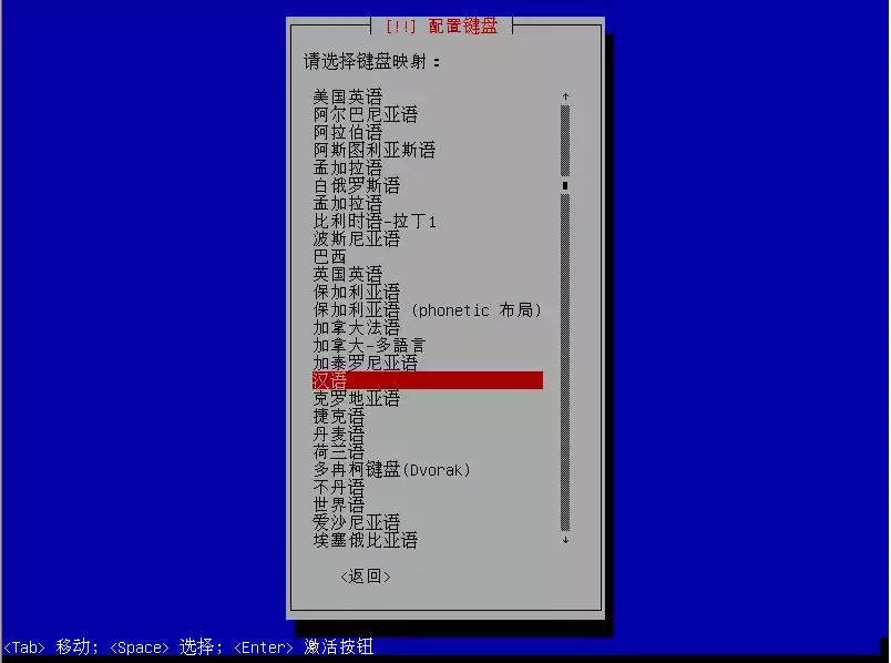 4,配置键盘,一般我们选择所对应区域语言的键盘类型,如果无特殊设定,完全可以选择“美国英语”以适配所有通用键盘。