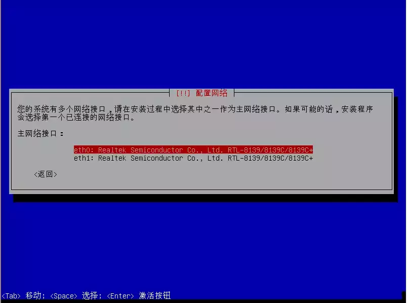 6,配置网络,首先选择所用网络接口(如果有多个网卡)。