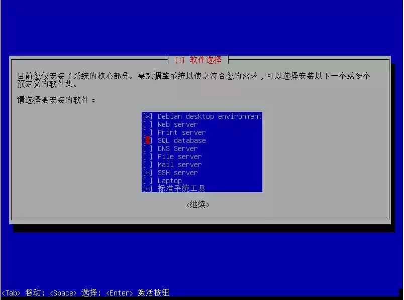 1、Debian desktop environment Debian桌面环境 2、Web server 网络服务器 3、Print server 打印服务器 4、SQL database SQL数据库 5、DNS server 域名系统(DNS)服务器 6、File server 文件服务器 7、Mail server 电子邮件服务器 8、SSH server SSH服务器 9、Laptop 笔记本 10、标准系统工具个人安装推荐选择必选1与10,其他可根据需要选择。