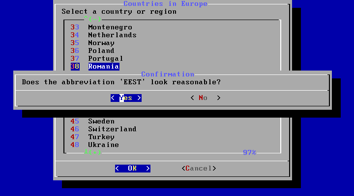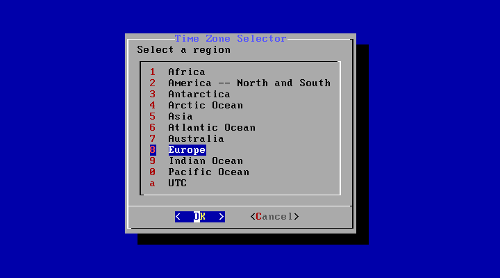 16. 下来设置时区,选择你国家所在的洲,按 OK.