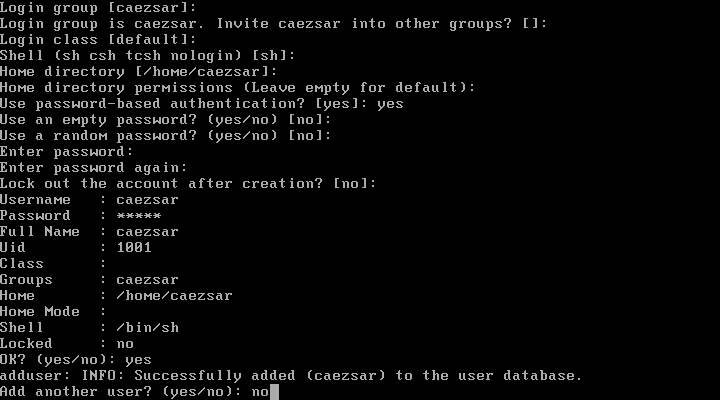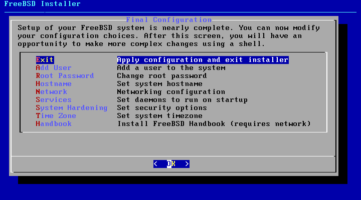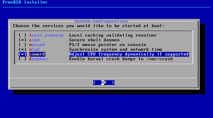 如果你的CPU支持自动功控,那么需要设置powerd服务。如果需要远程连接管理,那么需要配置SSH服务。NTP是自动同步网络时间的服务。选择完成后按OK 继续。