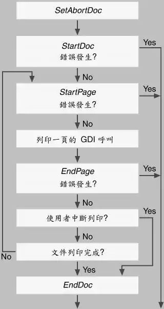 图13-3显示出正确列印多页文件之列印函式的呼叫顺序。检查bUserAbort的值是否为TRUE的最佳位置是在每个EndPage函式之後。只有当对先前的列印函式的呼叫没有产生错误时,才使用EndDoc函式。实际上,如果任何一个列印函式的呼叫出现错误,那么表演就结束了,同时您也可以回家了。
