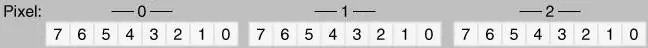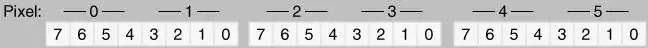 要了解图素编码的方式,让我们分别考虑四种情况。在下面的图表中,每个位元组的位元显示在框内并且编了号,7表示最高位元,0表示最低位元。图素也从行的最左端从0开始编号。
