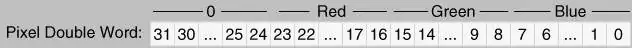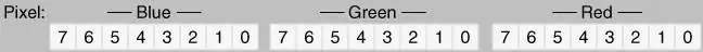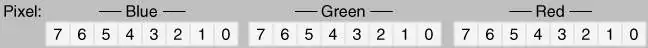 对於每图素24位元的DIB,每个图素需要3个位元组来代表红、绿和蓝的颜色值。图素位元的每一行,基本上就是RGBTRIPLE结构的阵列,可能需要在每行的末端补0以便该行为4位元组的倍数: