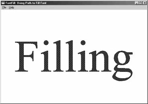 FONTFILL使用内定画笔绘制绘图路径的轮廓,但使用HS_DIAGCROSS样式建立红色的阴影画刷。注意程式在建立绘图路径时将背景模式设定为TRANSPARENT,在填充绘图路径时又将其重设为OPAQUE,这样它能够为区域图案使用蓝色的背景颜色。结果如图17-7所示。
