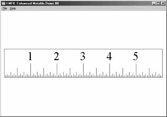 程式18-14中所示的EMF12程式,保留了EMF8中使用的DrawRuler处理方式,但是使用MM_HIMETRIC映射方式显示metafile。