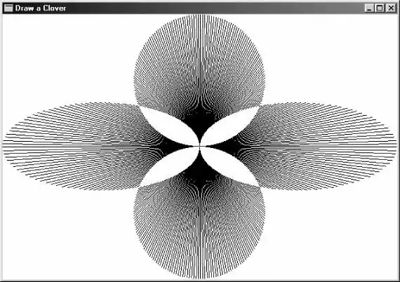 要用常规的方法画出这个图形,就必须根据椭圆的边线公式计算出每条直线的端点。利用复杂的剪裁区域,可以直接画出这些线条,而让Windows确定其端点。CLOVER如程式5-8所示。