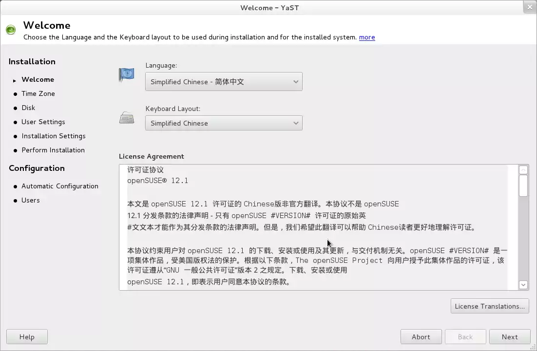 第一页是一些许可说明,以及选择语言(Language)和键盘布局(Keyboard Layout)。