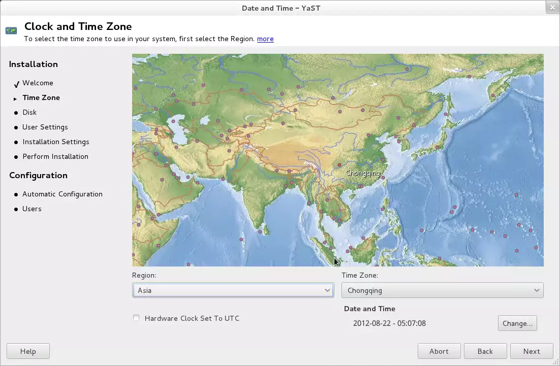 接下来是设置区域(Region)和时区(Time Zone),在此选择"Asia"和"Chongqing",当然也可以选择"Shanghai"。