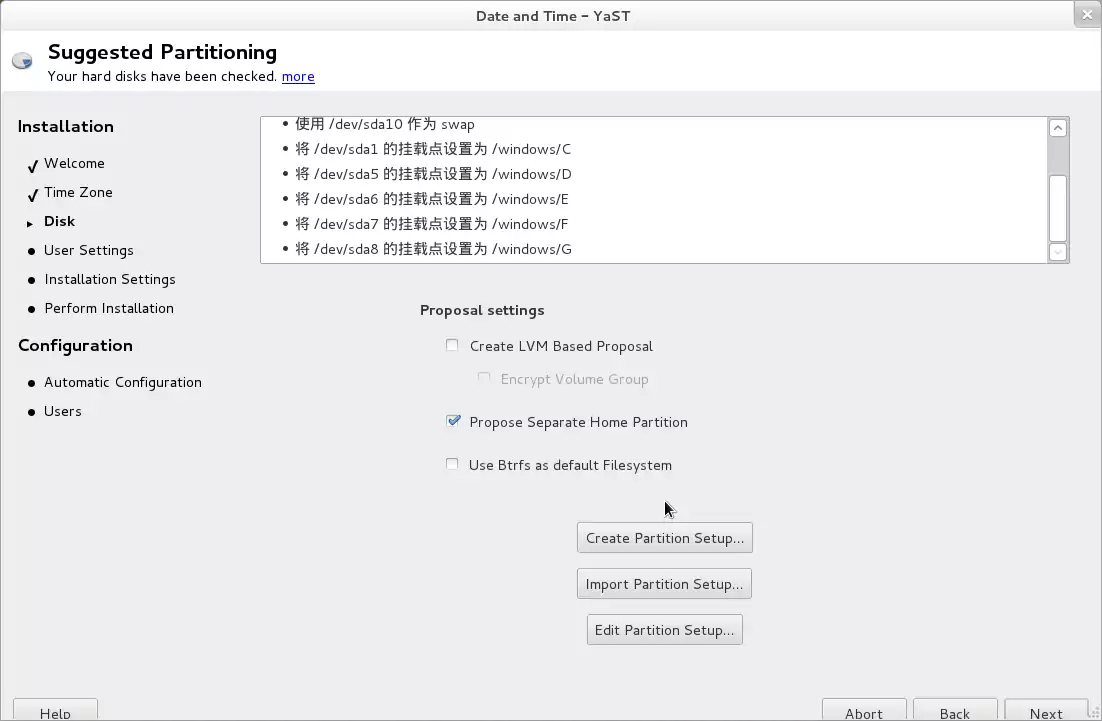 然后是设置磁盘(Disk),默认会有一个推荐分区方案(Sugested Partitioning),如果分区方案适合您的要求,即可采取默认设置。当然一般我们都需要自定义分区方案,因此我们点击"Edit Partition Setup"来手动设置设置分区。