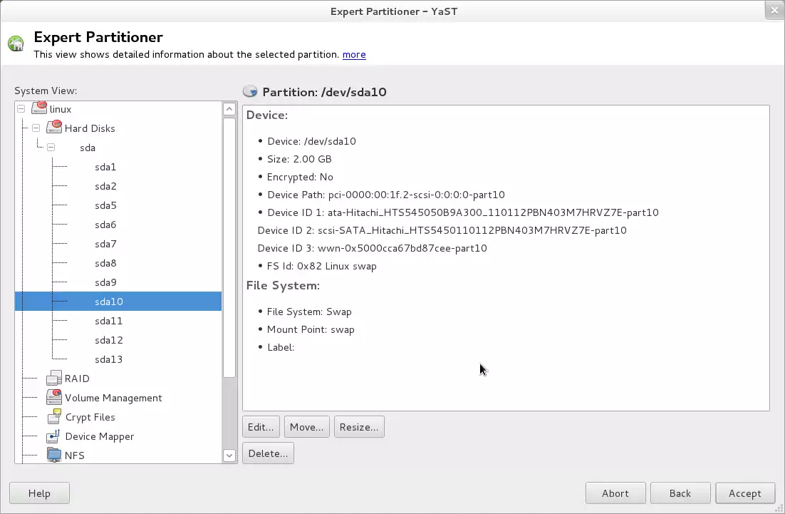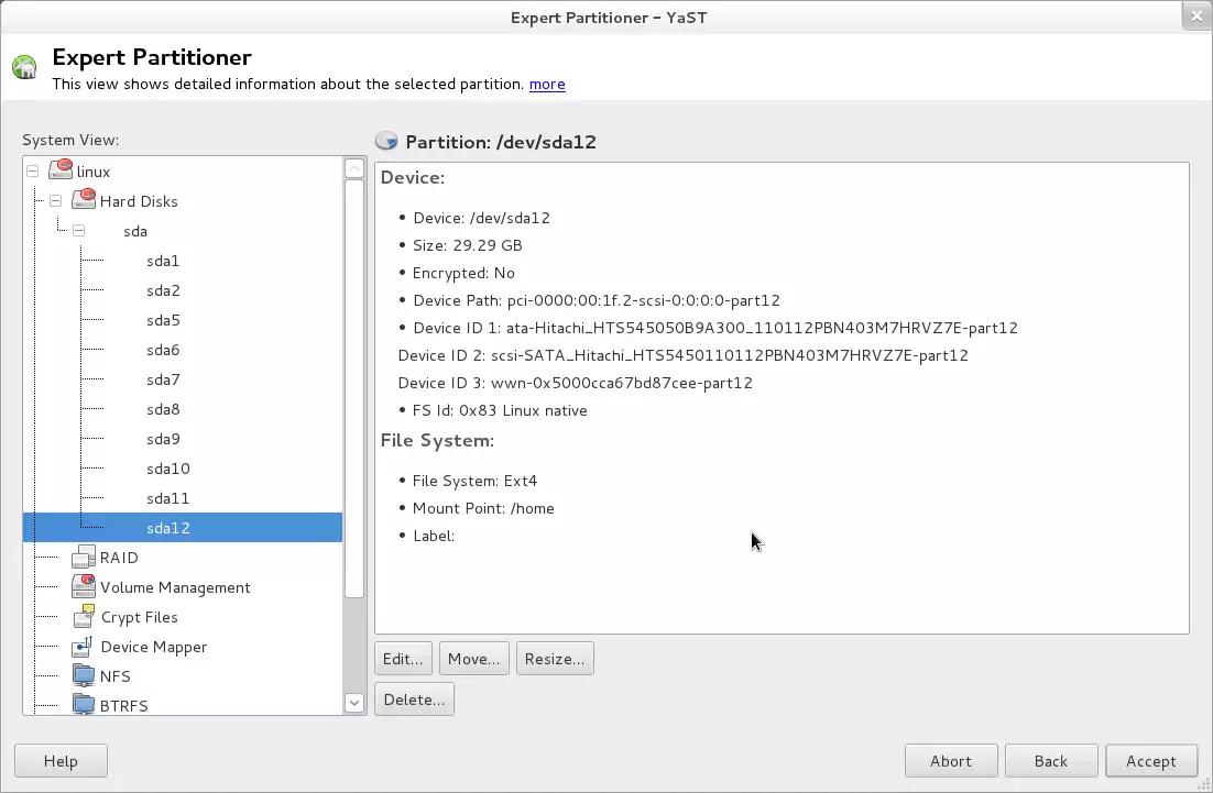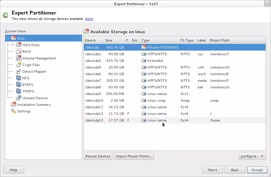 进入到专家分区(Expert Partitioner)我们即可看到本地磁盘的详细信息,然后我们可以针对自己的需要来进行手动分区。