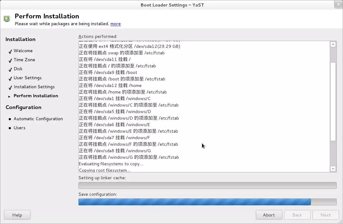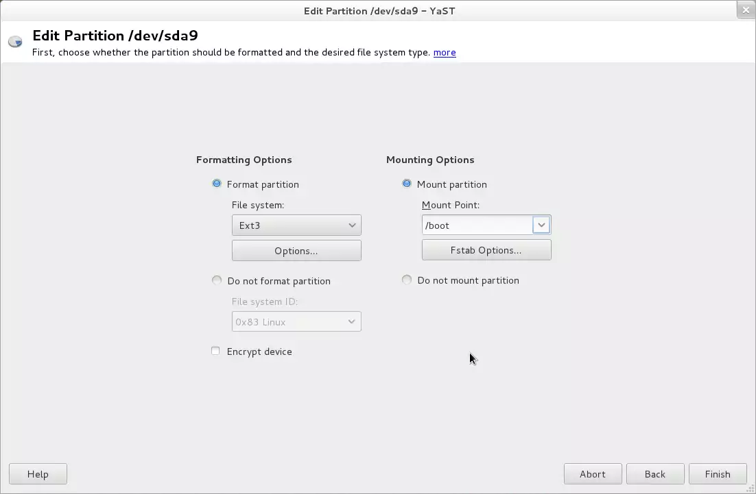 下面就是/dev/sda9的编辑页面,在此我们可以设置格式化选项(Formatting Options),挂载选项(Mounting Options)。参考/dev/sda9的设置,我相继完成来后面几个分区的编辑,完成后选择Next继续下一步安装。