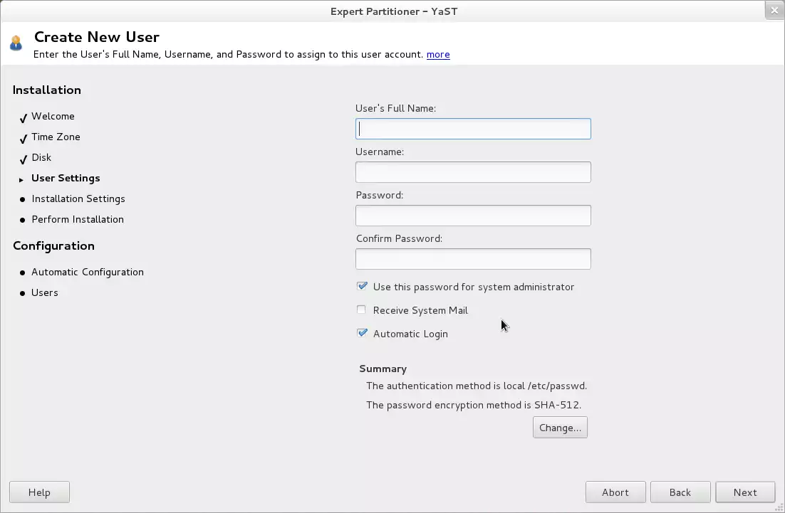 下面应该创建新用户(Create New User),注意"Use this password for system adminstrator"默认是未勾选的,建议勾选此项,要不在后面您还需要为root另行设置密码。