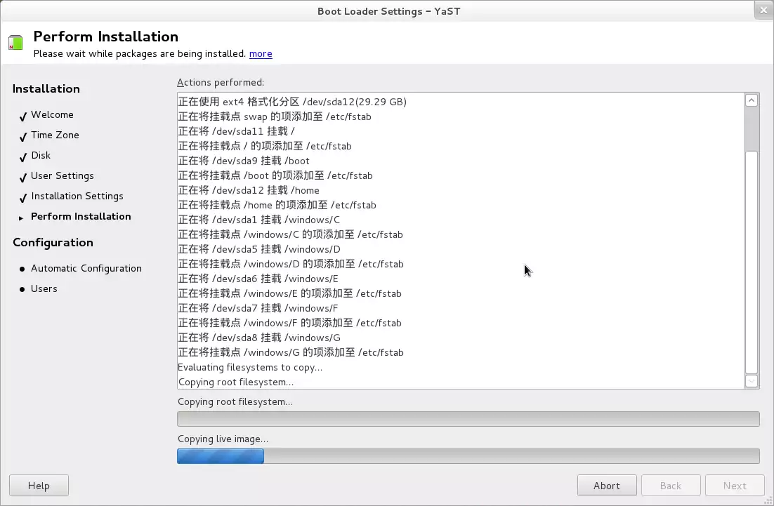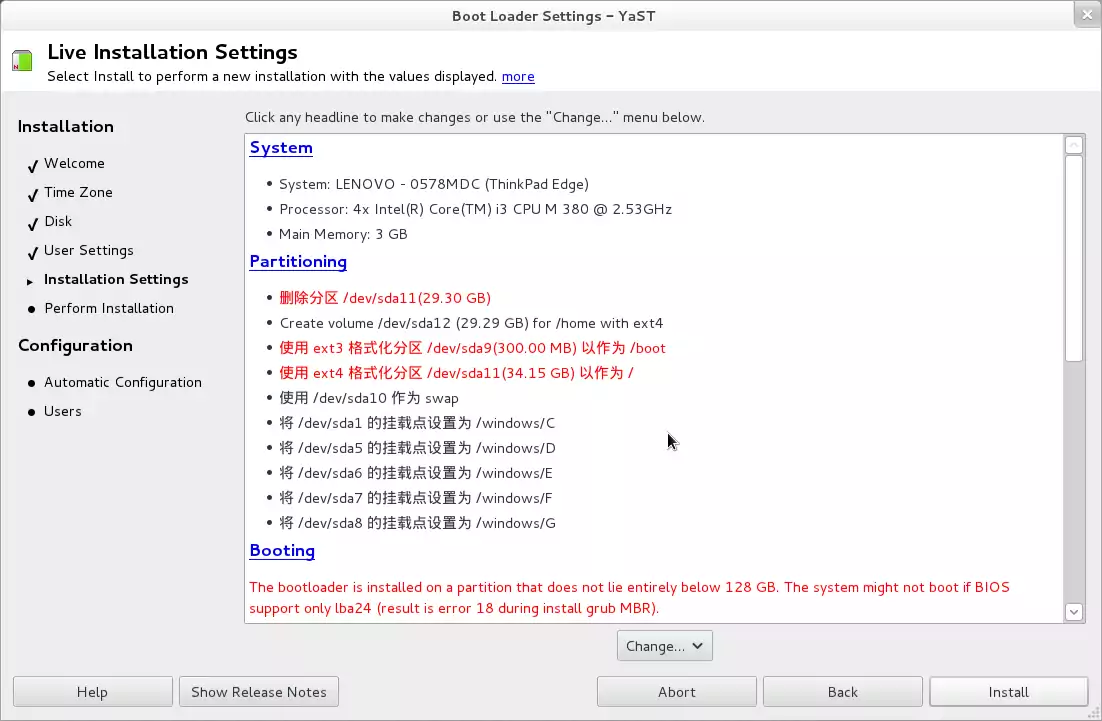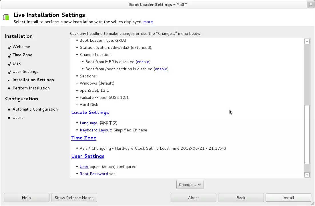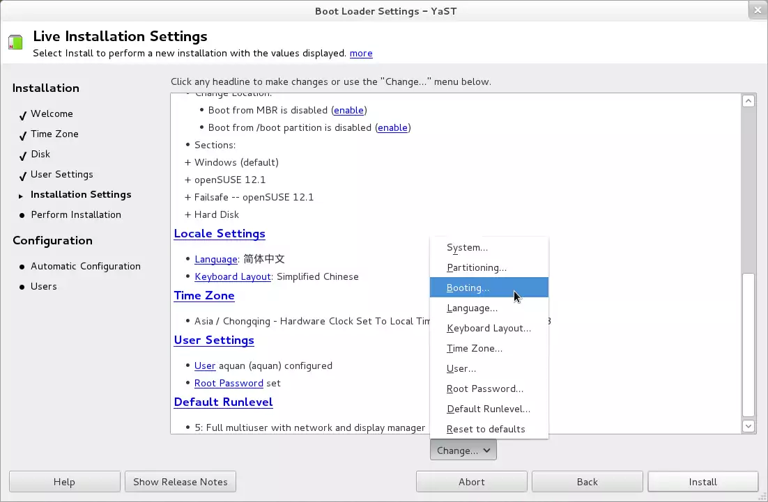 下来是安装设置(live installation settings)选项,在此可以编辑开机引导(booting)相关设置。点击change选择booting进入到设置界面。