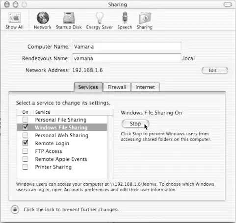 On Mac OS X, the graphical user interface (GUI) provides an alternative to using the command line. Launch the System Preferences application, and select Sharing (see Figure 2-4). Under the Services tab, turn on Windows File Sharing. This will make the aforementioned change to /etc/hostconfig and immediately execute the startup item.