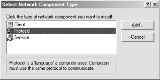 You can add the protocol by inserting the Windows distribution CD-ROM in your CD-ROM drive and clicking the Add button below the component window. Indicate that you wish to add a protocol by selecting Protocol and clicking "Add..." on the following dialog box, which should look similar to Figure 3-4.