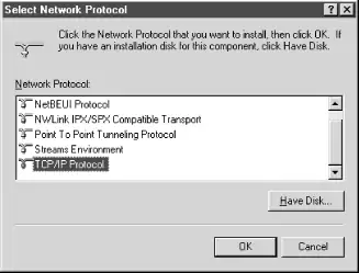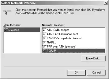 After that, select manufacturer Microsoft, then protocol TCP/IP, as shown in Figure 3-3, then click OK. After doing so, you will be returned to the network dialog. Click OK to close the dialog box, and Windows will install the necessary components from the CD-ROM and request that the system be rebooted. Go ahead and reboot the system, and you're set.
