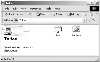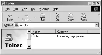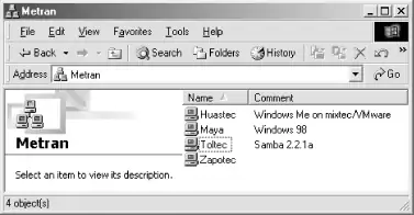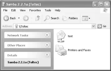 Now click View workgroup computers in the Network Tasks box at the left of the window. You should see your Samba server listed as a member of the workgroup. Double-click its icon, and you will see a window that looks like Figure 3-59.