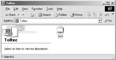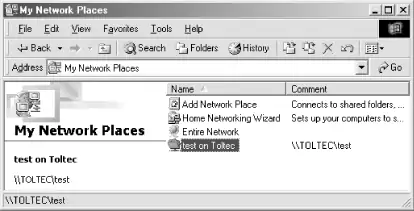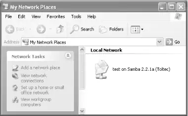 Now for the big moment. Your Samba server is running, and you have set up your Windows XP client to communicate with it. In the Start menu, select My Computer[9] to open the My Computer window. Click My Network Places, in the Other Places box in the left part of the window. You should see a folder icon for the test directory, as shown in Figure 3-58.