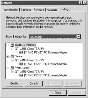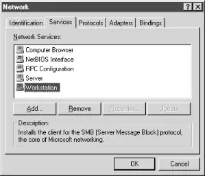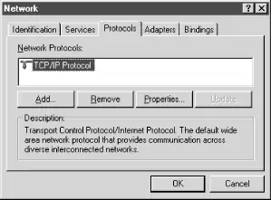 You might also see "File and printer sharing for Microsoft Networks," which is used to make the system into a server. In addition, you might see NetBEUI or Novell Networking. Definitely remove NetBEUI unless you are sure you need it, and if you don't have any Novell servers on your network, you can remove Novell (IPX/SPX) as well. To remove a service, simply click its name and then click the Remove button.