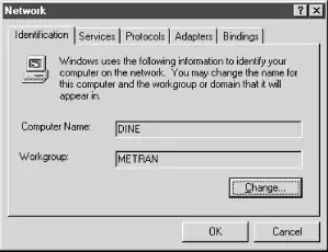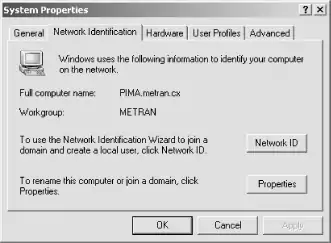 From the Control Panel, double-click the System icon to open the System Properties dialog box. Click the Network Identification tab, and your System Properties dialog box will look similar to Figure 3-39.