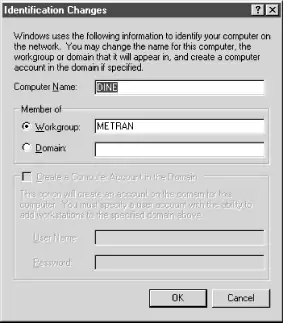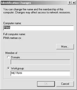To give your system computer a name and a workgroup, click the Properties button, which will bring up the Identification Changes dialog box, as in Figure 3-40.