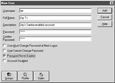 This password must be the same as the user's password on the Samba host. If you are using encrypted passwords, make sure this username and password are the same as what you used when you ran the smbpasswd program. Click the Create Password button, and you're done adding the account.