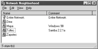 Now for the big moment. Your Samba server is running, and you have set up your Windows 2000 client to communicate with it. Double-click the My Network Places icon on the desktop, and then double-click the Computers Near Me icon to browse the workgroup. You should see your Samba server listed as a member of the workgroup, as shown in Figure 3-45.