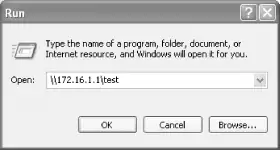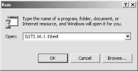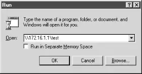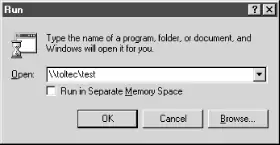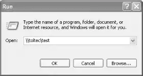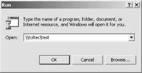 If you don't see the server listed in the workgroup, don't panic. Select Run... from the Start menu. A dialog box appears that allows you to type the name of your server and its share directory in Windows format. For example, you would enter \\toltec\test, as shown in Figure 3-60, and use your server's hostname instead of "toltec".