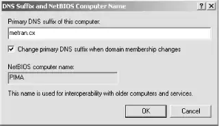 Enter the DNS domain name of this computer in the text field labeled Primary DNS Suffix for this computer:, and then click OK. You should now see the FQDN of this system underneath the label Full computer name: in the Computer Name Changes dialog box. Click the OK button and then reboot when requested to put your configuration changes into effect. Once again, log in using your administrative account.
