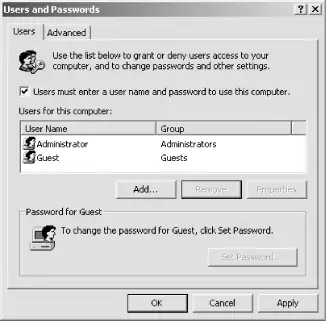 To add a new user, open the Control Panel, and double-click the Users and Passwords icon to open the Users and Passwords dialog box, shown in Figure 3-42.