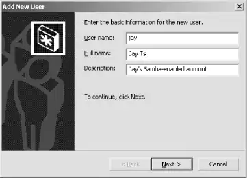 The directions in this section assume that your network is set up as a workgroup. If you have already set up your network as a domain, as we describe in Chapter 4, you do not need to follow the instructions here for adding a local user on the Windows XP client system. Simply log on to the domain from the client using a username and password in Samba's smbpasswd account database, and continue with the next section, Section 3.5.5.