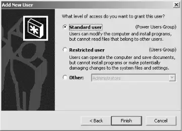 Pick a group for the user (the default Standard User should do), and click the Finish button. You should now see your new account added to the list in the Users and Passwords dialog box. Click the OK button to complete the process.
