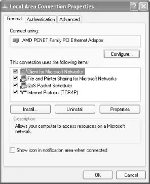 Go to the Control Panel and double-click the Network and Dial-up Connections icon. You should see at least one Local Area Connection icon. If there is more than one, identify the one that corresponds to the network adapter that is connected to your Samba network. Right-click the Local Area Connection icon, and click the Properties button. (Or double-click the Local Area Connection icon, and then click the Properties button in the dialog box that comes up.) You should now be looking at the Local Area Connection Properties dialog box, as shown in Figure 3-36.