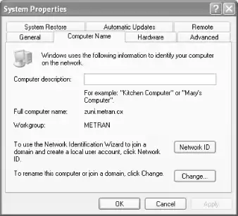 From the Control Panel, double-click the System icon to open the System Properties dialog box. Click the Computer Name tab, and your System Properties dialog box will look similar to Figure 3-52.