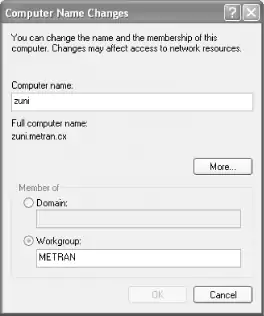 To give your system computer a name and a workgroup, click the Change... button, which will bring up the Computer Name Changes dialog box, as in Figure 3-53.