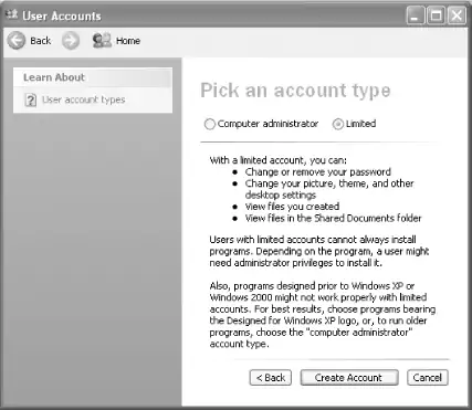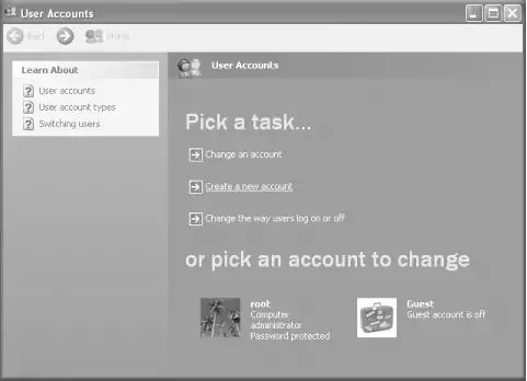 To add a new user, open the Control Panel, and double-click the Users Accounts icon to open the User Accounts window, shown in Figure 3-55.