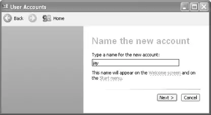 Click the Create a new account task, which will bring up the window shown in Figure 3-56. Enter the username, then click the Next > button.