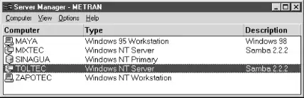 If the PDC is a Windows NT system, you can use Server Manager to check that the Samba server has been added successfully. Open the Start menu, then select Programs, then Administrative Tools (Common), and then Server Manager. Server Manager starts up with a window that looks like Figure 4-16.