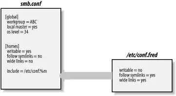 Because a new copy of the smbd daemon is created for each connecting client, it is possible for each client to have its own customized configuration file. Samba allows a limited, yet useful, form of variable substitution in the configuration file to allow information about the Samba server and the client to be included in the configuration at the time the client connects. Inside the configuration file, a variable begins with a percent sign (%), followed by a single upper- or lowercase letter, and can be used only on the right side of a configuration option (i.e., after the equal sign). An example is:
