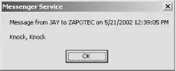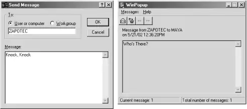 On Windows NT/2000/XP, the messenger service lets you receive messages without having an application already running; messages will automatically appear in a small dialog box on the screen when received, as shown in Figure 11-2.